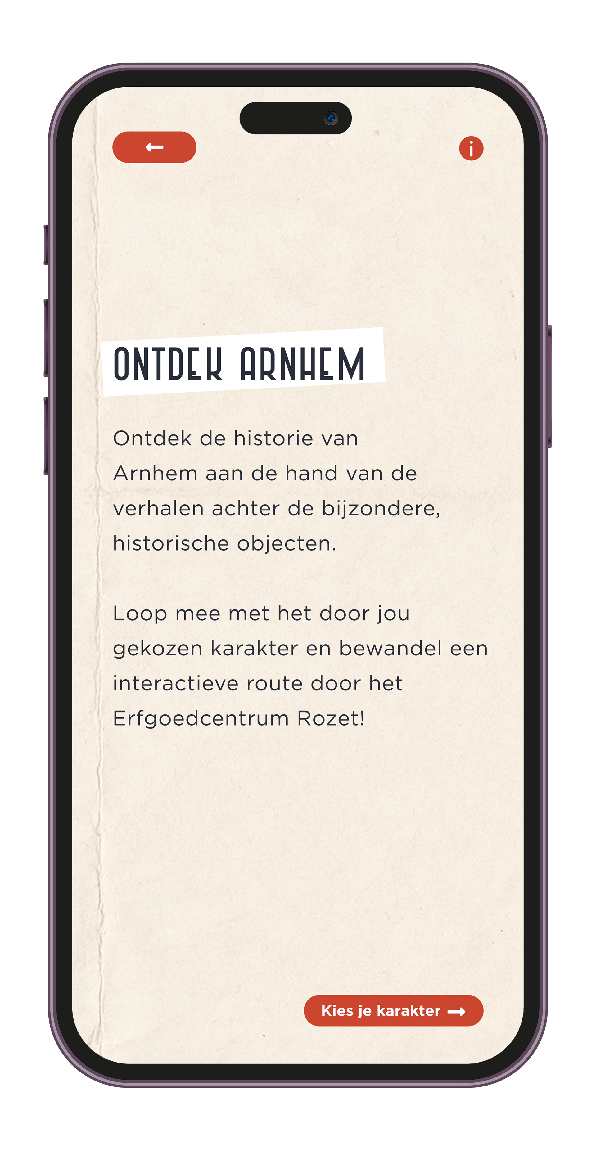 Onze oplossing hierop was het ontwerpen van een app die je middels een interactieve route met bijbehorende audio-tour door het museum leidt. Aan de hand van een van de door jou gekozen karakters kom je allerlei vragen tegen die je moet beantwoorden met behulp van de informatie van de tentoonstelling. Elk karakter heeft een aangepaste verhaallijn voor verschillende leeftijden. Zo leren bezoekers, van jong tot oud, op spelende wijze over de geschiedenis van Arnhem. Bekijk hieronder onze trailer!